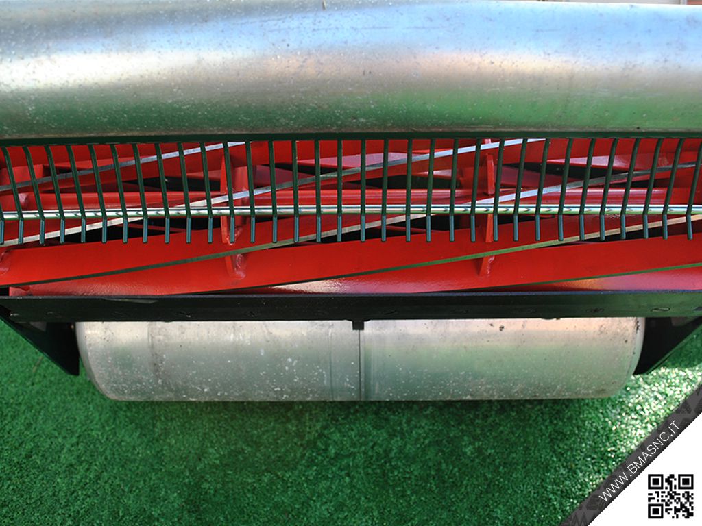 - Il rullo anteriore pieno è in acciaio zincato ed è dotato di cuscinetti a sfera. Un rastrello raddrizza erba posta nella parte posteriore serve per raddrizzare l'erba anche più bassa e permettere un taglio di massima qualità anche ad altezze minime.