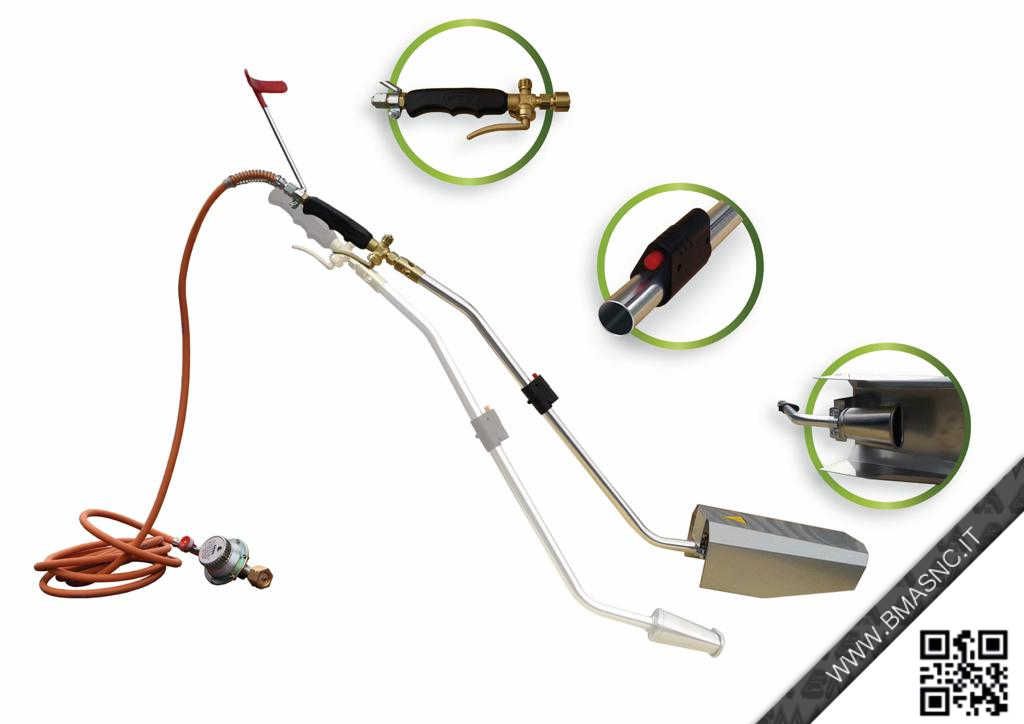 - La campana di diserbo è rimovibile. La rimozione della campana permette l'utilizzo della fiamma libera per il diserbo di angoli e zone dove la campana l'utilizzo della campana sarebbe un ingombro.